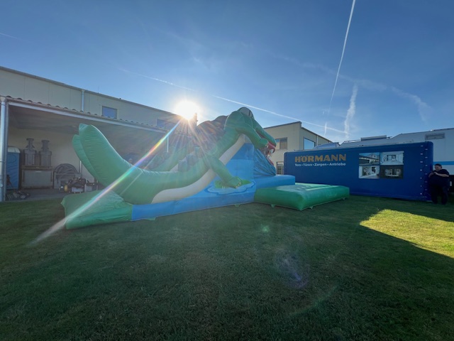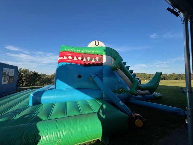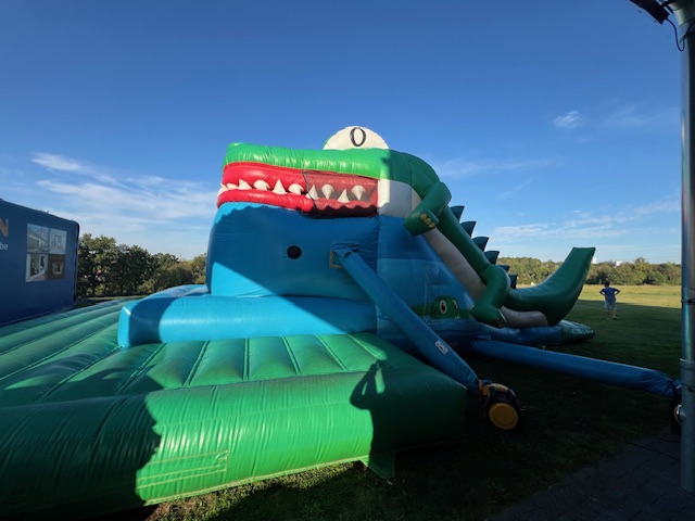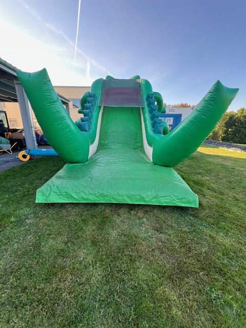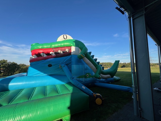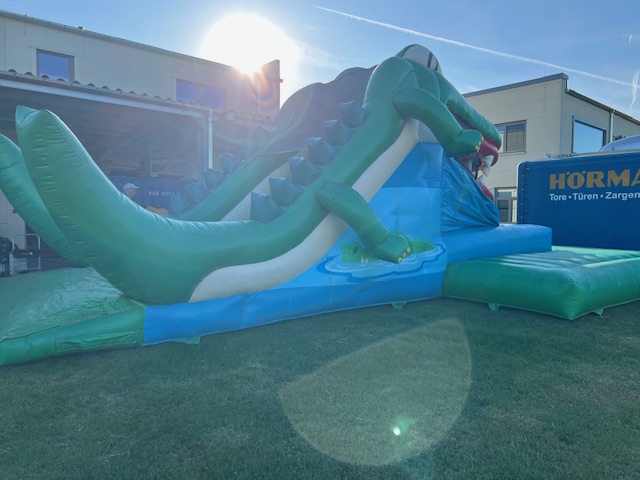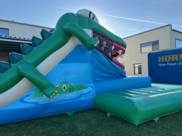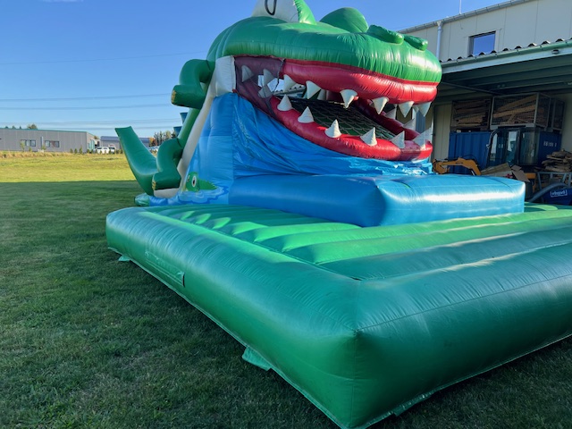 Das imposante Krokodil-Maul öffnet und schließt sich automatisch dank einer Zeitschaltuhr und eines zweiten Gebläses – so entsteht ein spannender Spieleffekt, bei dem sich die Kinder trauen müssen, mutig durch die Zähne ins Innere zu klettern! Wer es geschafft hat, kann sich im Bauch des Krokodils verstecken oder direkt über die lange Rutsche auf der Rückseite wieder hinaussausen.